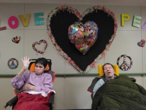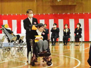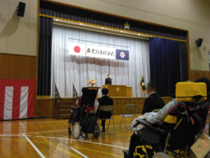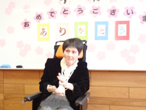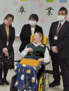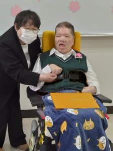 学齢超過の方2名が、ほしみ高等学園を卒業しました。学校での予行演習は2人揃って参加しましたが、卒業式本番は、お一人での参加でした。後日、本番に参加出来なかった方の卒業証書授与式を、緑ヶ丘療育園内で行って頂きました。ほしみ高等学園の諸先生方、本当に有難うございました。